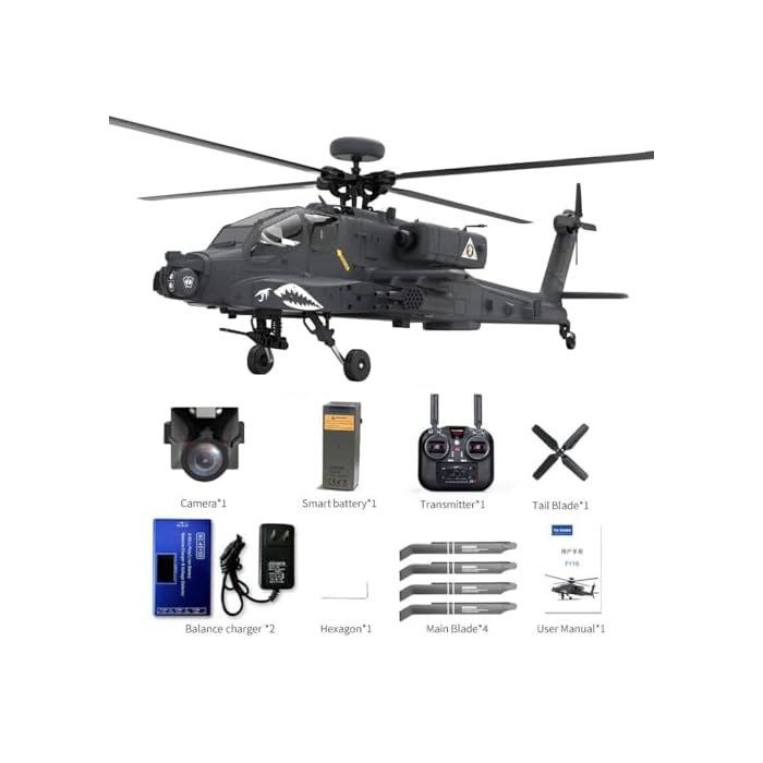 High-Simulation Helicopter Model: This model is a scaled-down version of an apache helicopter, featuring a 32:1 scale. It boasts a highly detailed and realistic appearance, complete with cool lights and shock-absorbing landing gear, making it perfect for enthusiasts and collectors