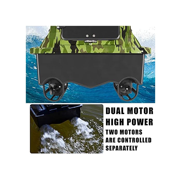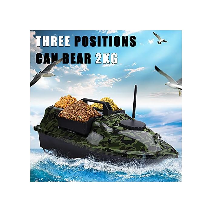 VALUE-FOR-MONEY PERFORMANCE: smart remote keep watch over distance 100-500m (clear and non-interfering water surface), navigation can also be controlled one after the other, low noise, high performance, with night fishing LED spotlights and three bait bins and dual-motor design, running faster Fast, the loadable weight is about 1-2 kg.